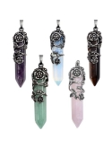 Healing crystal rose quartz pendant necklace with antique silver wrap .
