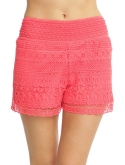 Crochet lace shorts, comfort stretch waist, scalloped hem and floral design.