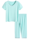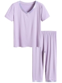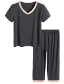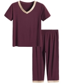 2PCS pajama set: short sleeves, V-neck with pretty picot trim top and elastic waist, capri pants
