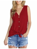 Features: Waffle knitted blouse with button down design,Sexy V Neck,Sleeveless tunic tops, Curved hemline, Tie Front Hem design, Loose fit Plain Shirts