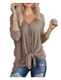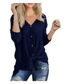 Features: Waffle knitted blouse with button down design,Sexy V Neck,Long sleeve tunic tops, Curved hemline, Tie Front Hem design, Loose fit Bat Wing Plain Shirts