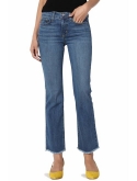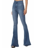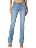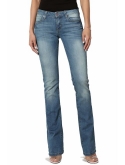 Whiskered, faded, mild distressed, stretch denim bootcut jeans, Zip fly with button closure, five-pocket silhouette, belt loops, mid rise