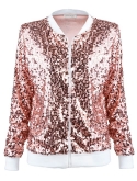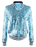 SPARKLY ZIP UP BOMBER STYLE JACKET. Sporty meets sparkle with this all-over long sleeve sequin bomber style jacket with full front zip closure and roomy fit. Available in seven different colors to match your unique style.