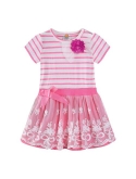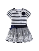 Boutique stripe dress for girls,delicate decoration sewn on chest, flowy floral lace hem.