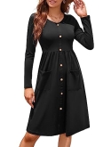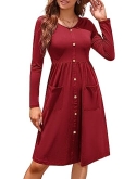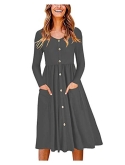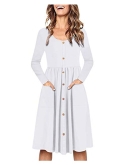 OUGES Women's Long Sleeve V Neck Button Down Skater Dress with Pockets