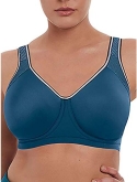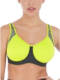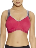 Sports bra featuring molded cups and mesh panels for breathability Adjustable shoulder straps Hook and eye closure at back Double-lined for support Antibacterial fabric technology for odor resistance Moisture-wicking Coolmax fabric in inner bra