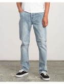 Slim fit stretch denim jean Zipper fly closure RVCA woven label at coin pocket VA embroidery at back pockets Back patch pockets