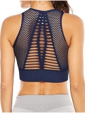 Front with inner lining, not see through; adds breathable mesh layer, looks more chic.Full support sports bra,a little snug to get in,feel comfortable after in,keep everything in place; Pullover style.Backless design provide extra ventilation, enhances the sweat-wicking performance; gorgeous hollow out eyelet pattern, look chic and stylish,visiually look more flattering, perfectly dress your back silhouette.