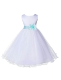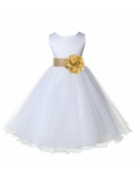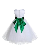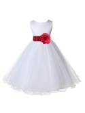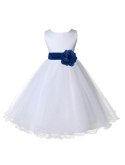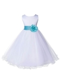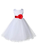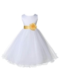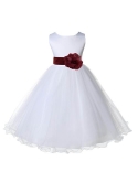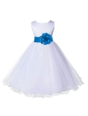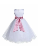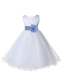 The elegant upper bodice feature is made out of white Satin Poly. The waistline is decorated with a removable choice of color sash and flower to make this dress more elegant. The back of the dress has a zipper closure and a nice bow you can tie for a snug fit.