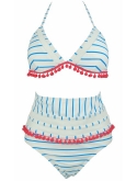 Pattern: Breathable Mesh Striped High Waisted Tassel Trim Bikini Set