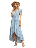 Features:Floral Print Maxi Long Dress,Cross V Neck, Short Sleeve,Elastic Waistband,High Low Hemline,Ruffle Cap Sleeves,Floor Length,