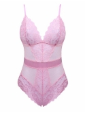 See through teddy lingerie features unlined lace cup, scalloped lace trim, adjustable spaghetti strap, silky satin bow tie around waist, hook and eye closure in the back of the bra area, cheeky high cut thong bodysuit.