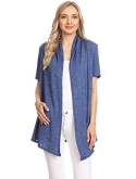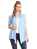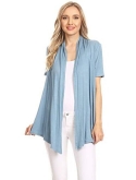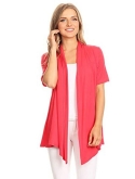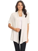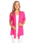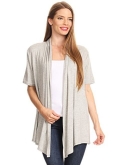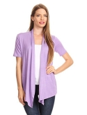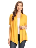 Solid, loose fit cardigan with an open front, short sleeves, and asymmetrical hem.