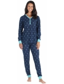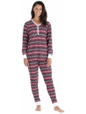 Top: V-neck henley design with 4 functional buttons, long sleeves, and contrasting ribbed knit cuffs available in several patterns including stripes, fair isle, snowflakes, and polka dots