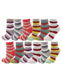 12 PAIR BULK PACK : Each bulk pack includes 12 pairs of assorted fuzzy socks. Sock size 9-11 will fit women and girls shoe sizes 5-10. Makes the perfect gift during the holidays, Christmas, birthdays, donations or simply a thoughtful winter gift. Made with polyester. Note: Some styles will not have gripper bottoms on them - please see the color name title and refer to images.