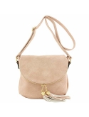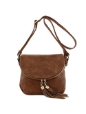 10.5" (L) x 9" (H) x 4.5" (D) Zipper closure with flap Faux leather & gold tone hardware Adjustable shoulder strap with 25" drop 1 open pocket & 1 zipper pocket inside