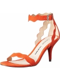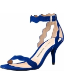 Sandal featuring covered kitten heel and scalloped straps Adjustable ankle strap with metallic buckle Lightly padded footbed