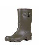 Mid Calf Rain Boot features artificial leather collar at top and decorative buckle on side