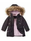 Cozy fleece lined zip-off detachable hood with faux fur trim; Elasticized waist ensures comfortable snug fit