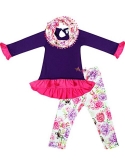 3 piece set featuring: a ruffles tunic top, matching leggings and scarf ! Made with soft cotton fabric, super comfy, while still being so stylish! She'll stay cute and comfy in this darling three piece scarf set. A Purple high low tunic top paired with matching floral leggings and scarf. She can show off her own style in this outfit. Pair each piece with other items to create many looks.