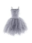 Beautiful and Chic DesignSpaghetti strap, the neckline adorned with rhinestones, beads and sequins, embellished with exquisite feather fringes. The skirt is made with 2 layers of tulle with 1 layer cotton lining underneath. Additional irregular tulle ruffles are stitched on the tulle, makes the dress fluffy