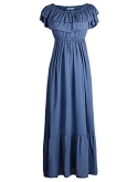 A gorgeous ankle length dress with square neckline, accented by a ruffle fringe and a gathered stretchy waist. This short sleeved dress can be worn as is or adjusted for a more sleeveless look.