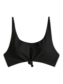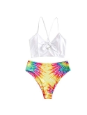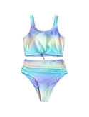 This two pieces bikini features a tie dye tank style top with a cute knot front to enhance the solid bodice and high waisted rainbow ruched bottoms