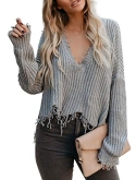 V neck,Long sleeve,Striped colorblock,Dropped shoulder,Ragged cuff and hem