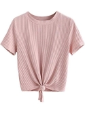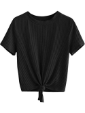 Casual plain short sleeve knot ribbed crop top Soft and stretchy fabric, breathable Perfect with jeans or shorts Wash Recommended With Cold Water / Do Not Bleach / Hang Or Line Dry Please refer to the detailed size measurements below.
