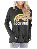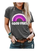 Features: Good Vibes Letters Print, Short Sleeve, Crew Neck, Summer Casual Loose Cute T Shirt for Women with rainbow on the front.