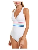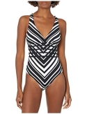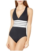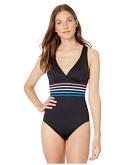 Beautiful bands of brilliant color pop against a black background on this sleek and sophisticated one-piece suit. Horizontal stripes beneath the sexy V-plunge neckline define your waist and a built-in tummy control panel smooths and slims. The fixed multi-strap cross-back design keeps everything neatly tucked in.
