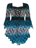 EVERYDAY LACE: Pointed fairy sleeves, lace upper arm cuffs, and cascading babydoll skirt add fashionable touches to these versatile shirts.