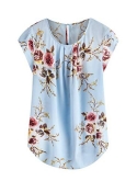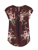 Feature: Floral Top, Round Neck, Cute, Pleated, Casual Blouse, Flower Print, Regular Fit, Button, Cap Sleeve, Asymmetrical, Petal Sleeve, Curved Hem.