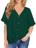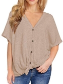 Features: Waffle knitted blouse with button down design,Sexy V Neck,Short sleeve tunic tops, Curved hemline, Tie Front Hem design, Loose fit Bat Wing Plain Shirts