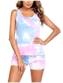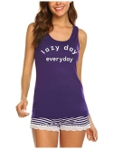 FEATURES: Pajamas for women featuring sleeveless tank top and classic striped shorts, scoop neck, cute printed and lace trim hem.