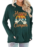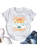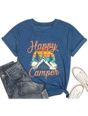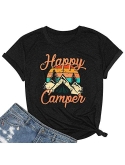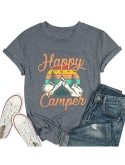 T-Shirt Feature: Happy camper letter print graphic t shirt, womens camping graphic tshirt, classic o-neck tee, simple print shirt, relaxed fit, lightweight, slouchy shirt, happy camper short/long sleeve shirt. A great gift for those who love camping, camping shirt, happy camper Tshirt, glamping shirt