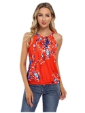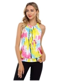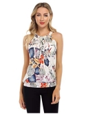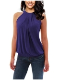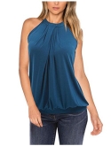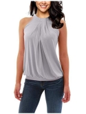 Features: ladies halter blouse top, halter tank tops, o neck, round neck, halter crew neck, sleeveless, pullover, pleated twist front, solid color, back keyhole with button, fitting top.