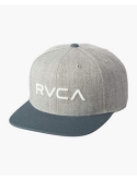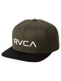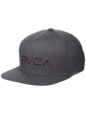 Mens snapback hat, RVCA logo embroidery at front and VA embroidery at back, Mid fit snapback, Structured front, Interior woven fit label, Flat bill, Woven twill fabric.