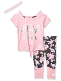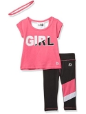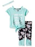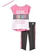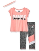 Short sleeve scoop neck active top pulls on over head. Ready set crushed it graphic on front. Coordinating headband included. Pull on charcoal heather performance jersey legging. Comfortable wide waistband with contrast detail on left leg.