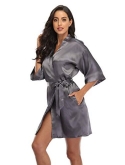 Features: Solid color satin robe, oblique v neck, classic yet sexy. Two side pockets, convenient to hold your phone, keys or other carry-on items.
