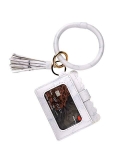 PREMIUM MATERIALSMade of PU leather and metal alloy. It include a keyring, a stylish tassel, a gold ring, a white round golden ornament and a detachable mini RFID credit card holder keychain.