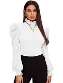 Design: Gigot sleeve, pearls beaded, mock neck, stand collar, kehole back with button, solid blouse