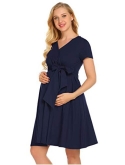 Classic Maternity Nursing Dress: A basic, solid hued maternity dress featuring wrap crossover v-neckline, high waistline, short sleeve, elastic cinching under the bust with bow design.
