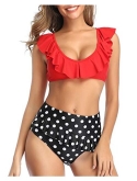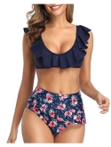 Sexy bikini set features removable padded, ruffled front, bright solid color, deep v-neck,and clasp hook closure on the back .High waisted tummy control bottom make you elegant, charming and sweet.