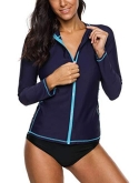 FRONT ZIPPER is easy on/off, crew-neck rashguard top featuring raglan long sleeves and floral/splice at both side