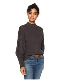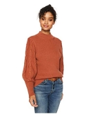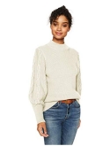 Ribbed mock neck pullover featuring blouson sleeves with cable stitch details