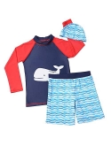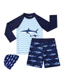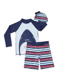 Two-piece swim set with long-sleeve rashguard and swim trunk. Swim trunk with elastic waistband and drawstring closure for secure fit