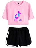 Womens TIK Tok Crop Top T-Shirt with Shorts 2pcs Set Tracksuit Sportswear Suit for Girls