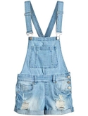 Classic Look: fashionable denim overall shorts with distressed design and raw hemline and chest bib pockets