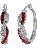 Hoop earrings featuring a twist design with Siam red and clear Swarovski crystals pave set in 925 sterling silver